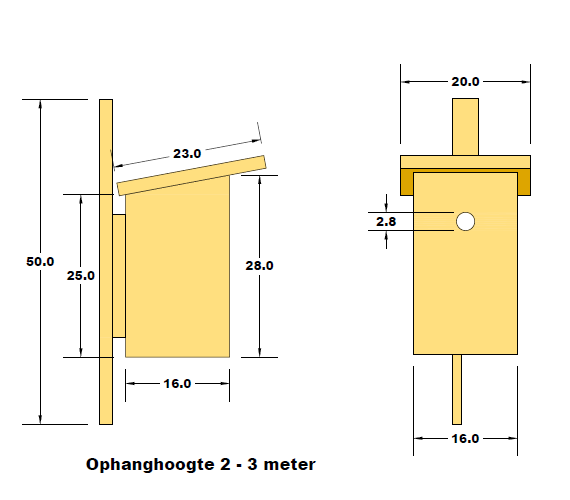 Afmetingen van de "Koolmees" nestkast